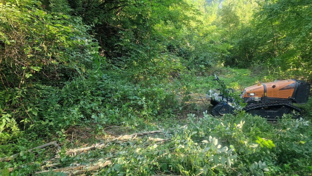 And so, to make it nice, the blackberries and all that overgrowth are now being shredded with a mulcher to make the forest breathe. Uroš Zalokar has studied the tree species thoroughly, so that the most troublesome invasive ones will be removed, leaving the nicer, stronger trees. The aim is that by thinning and destroying invasive species, the forest will be helped to flourish more quickly with strong, healthy trees. We will be able to walk in the beautiful forest around the Acrobat City.