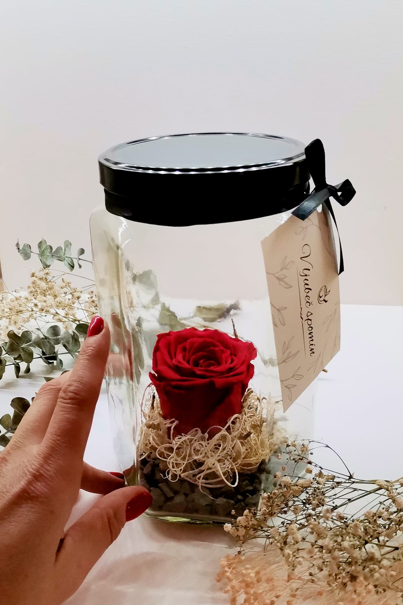 The desire to place it on a tombstone led to the idea of the Memory range, where a real prepared rose with decor is captured in an elegant glass jar. A lasting tombstone decoration that says a thousand words in itself and pays tribute to our departed.